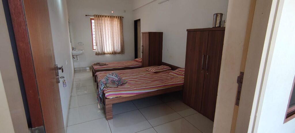 A tranquil double bedroom, offering comfort and convenience for devotees during their spiritual visit.